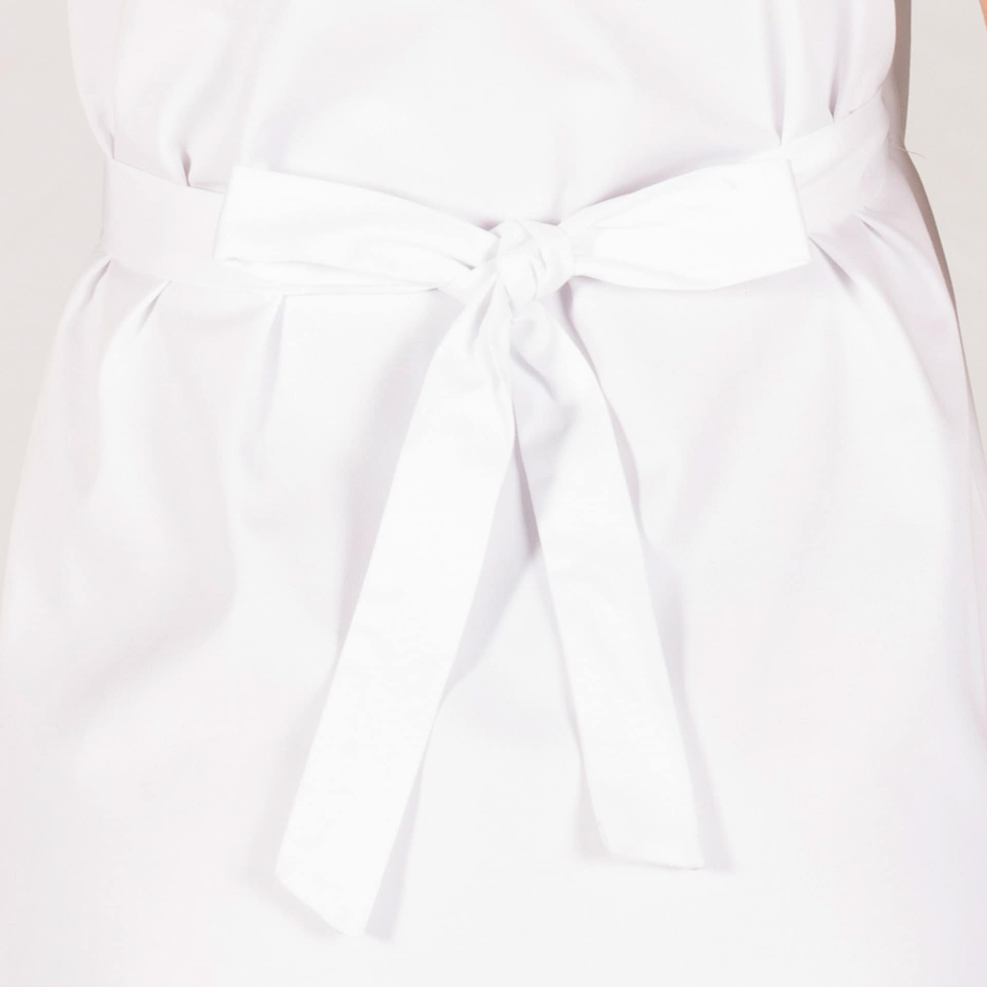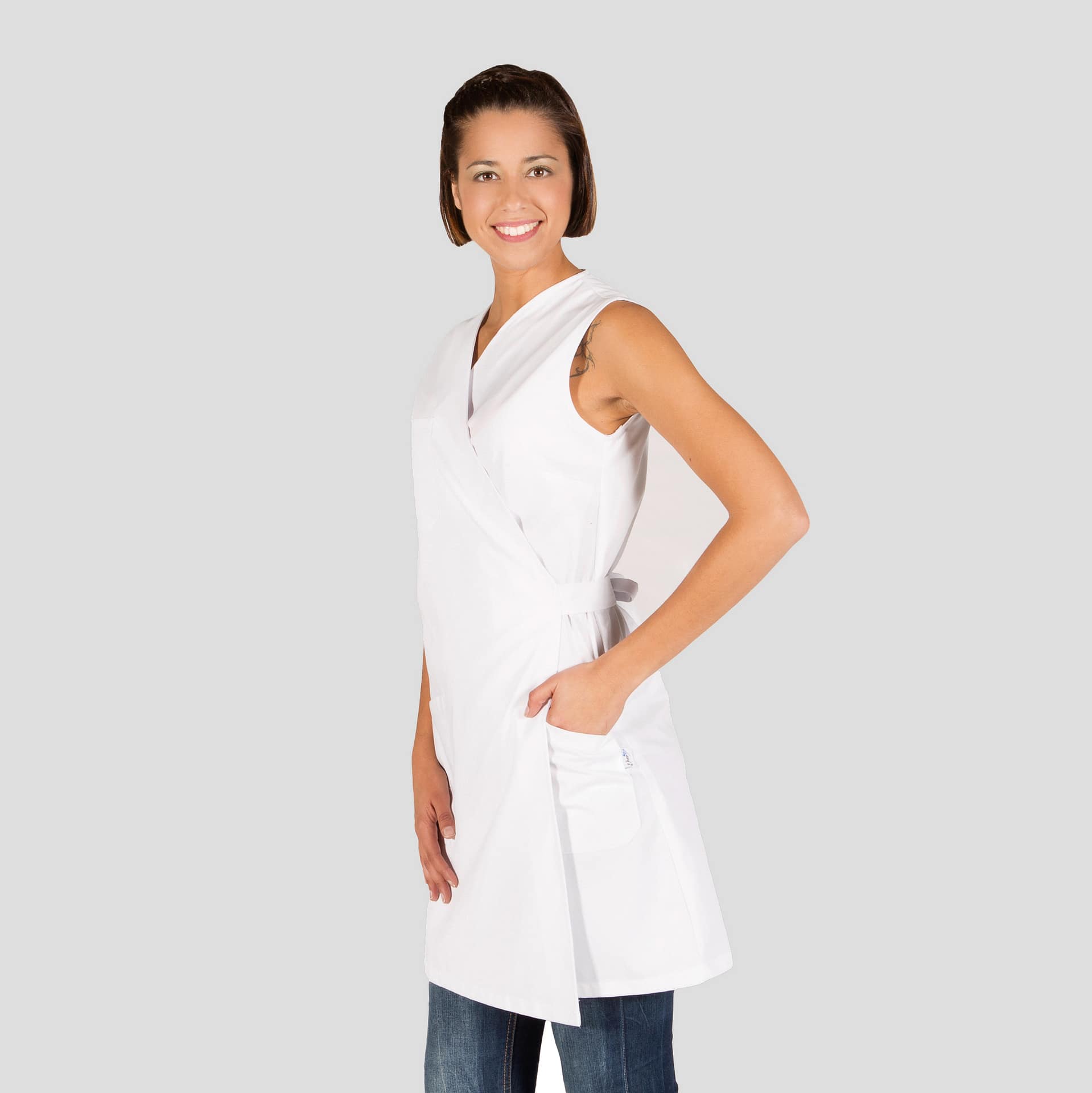 - Descripción: -Bata de señora sin mangas. -Cuello sin solapa. -Pinzas delanteras y en espalda. -Cinturón en espalda. -Largo aprox. 93 cm.