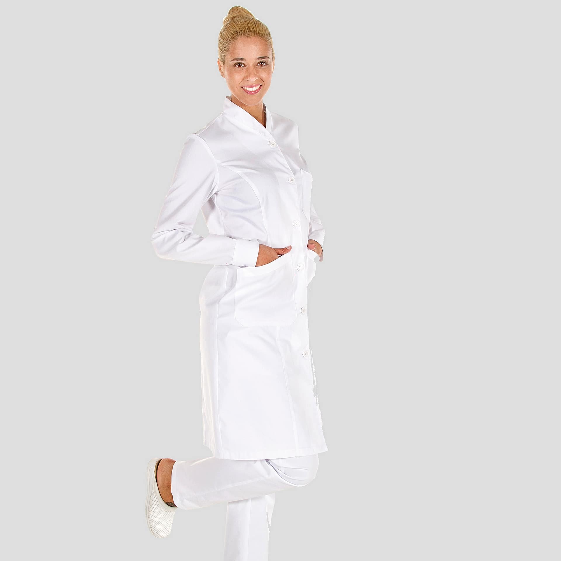 - Descripción: -Bata de señora de manga larga. -Puños abotonados. -Costadillos delanteros y espalda. -Cinturón en espalda. -Largo aproximado 104 cm. -Prenda ajustada.