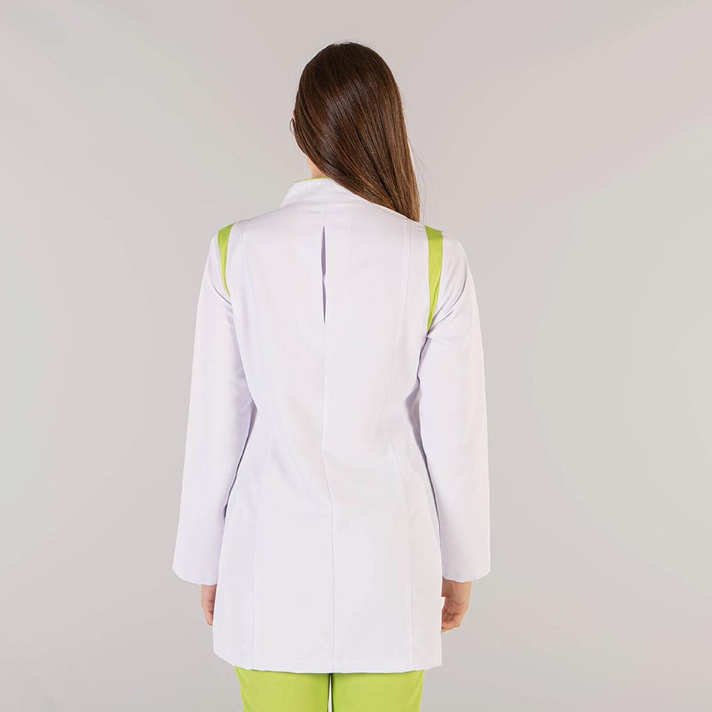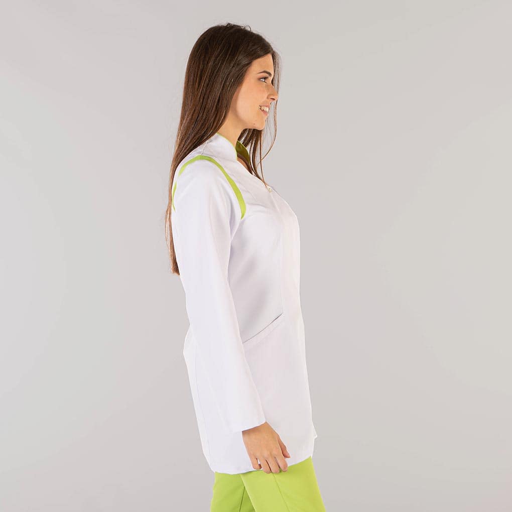 - Descripción: Bata de mujer de manga larga – Detalles de color en tejido AEROSILVER – Costadillos en delantero y espalda – Dos bolsillos entre costadillos – Pliegue en espalda – Botones de presión ocultos – Largo aprox.: 82 cm – Prenda semiajustada
