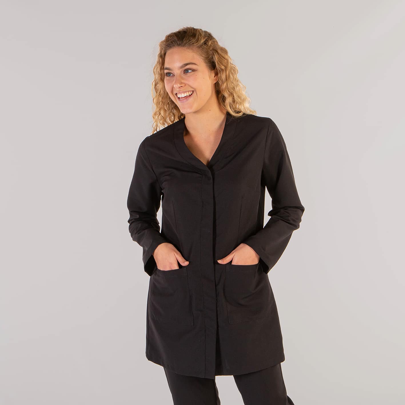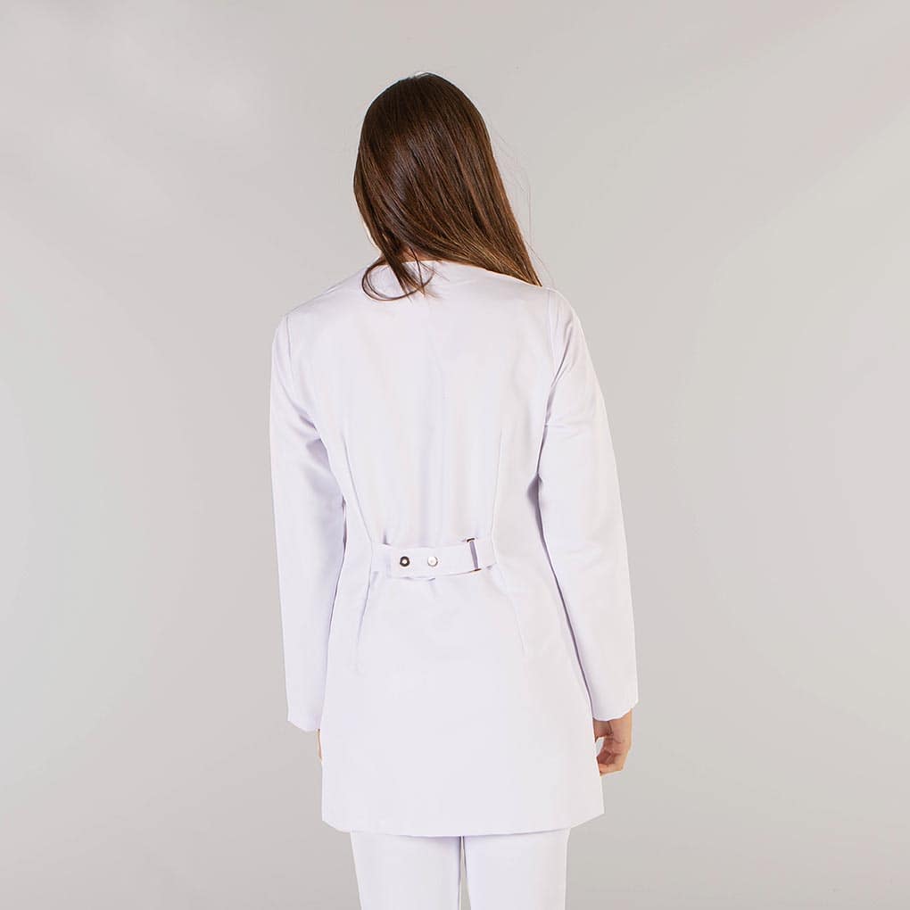 - Descripción: Bata de mujer de manga larga – Pinzas en delantero y espalda – Dos bolsillos de parche en delanteros – Pinzas en espalda – Cinturón trasero – Pliegue en espalda – Cierre mediante botones de presión ocultos – Largo aprox.: 80 cm – Prenda semiajustada.