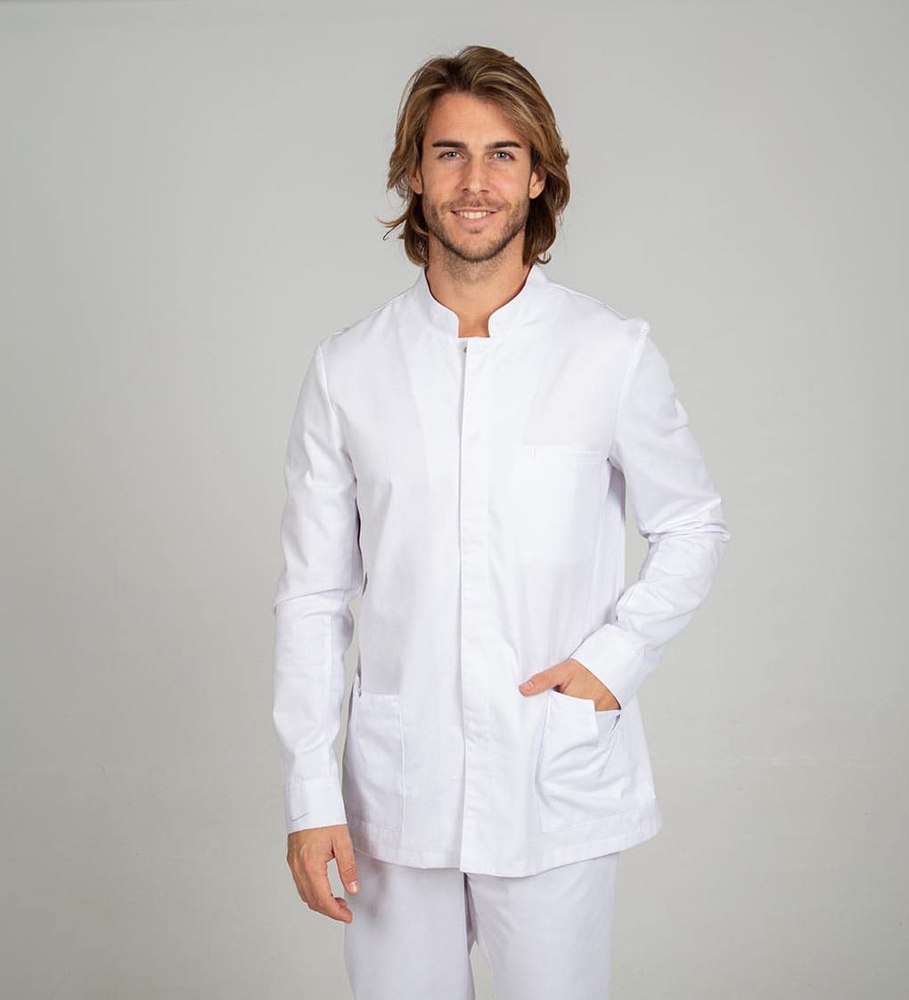 - Descripción: Casaca para hombre en manga larga, con cuello mao, cierre en puños y delantero mediante botones de presión ocultos, un bolsillo de vivo en el pecho izquierdo y dos bolsillos delanteros. Prenda semi ajustada, con costadillos en delantero y trasero. Confeccionada en SARGA de color blanco, se sirve con triángulos decorativos para los bolsillos y cinturilla intercambiables en color blanco, pudiendo pedir aparte el pack en otros colores, referencia 6181. Largo aproximado 98 cm – Prenda semi ajustada.