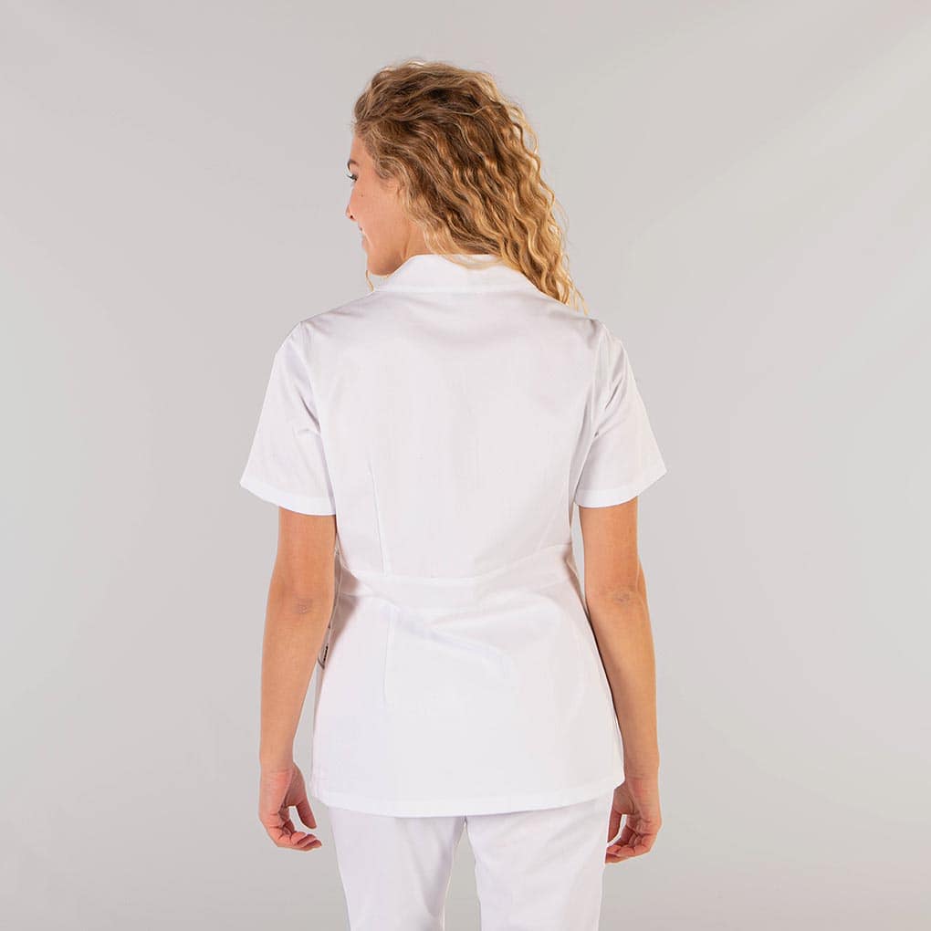 - Descripción: Casaca para mujer en manga corta, con original cuello, dos bolsillos de parche delanteros y cierre mediante botones de presión ocultos. Prenda semi ajustada, con costadillos en delantero y pinzas en la espalda. Confeccionada en SARGA de color blanco. – Largo aprox. 67 cm