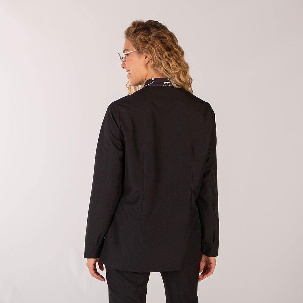 - Descripción: Casaca para mujer en manga larga, con cuello mao, dos bolsillos en delantero, puños con corchetes y cierre mediante botones de presión ocultos. Prenda semi ajustada, con pinzas en pecho, delantero y espalda. Confeccionada en MICROFIBRA de 100% Poliéster, un tejido antibacterias, altamente transpirable, tolerante a salpicaduras de lejía, lavable a 90º, seca rápido, sin necesidad de planchado y repelente al cabello y pelo de mascotas. Disponible en color blanco o negro con un original estampado de gafas en cuello y bolsillos. Largo aproximado 70 cm – Prenda semi ajustada.