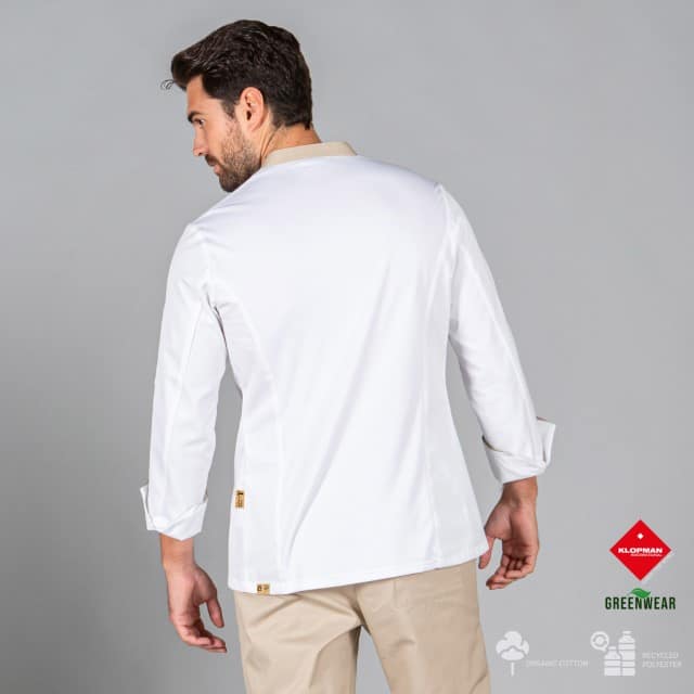 - Descripción: Chaqueta para hombre en manga larga, con puños vueltos, un bolsillo en la manga izquierda y cierre cruzado mediante botones de presión ocultos. Prenda semi ajustada, con costadillos en delantero y espalda. Confeccionada en tejido KLOPMAN de color blanco de 50% POLIÉSTER RECICLADO – 50% ALGODÓN ORGÁNICO, un tejido respetuoso con un medio ambiente sostenible, dentro de la línea NATUREWEAR de Uniformes Gary´s. Además, cuenta con tejido técnico AEROSILVER en toda la espalda y combinación en cuello y vivos en color arena o gris perla. Ideal para uniforme de camareros, cocineros y chefs en hostelería, restauración y cocina en general o para comercio. Disponible también en modelo para mujer referencia 942900.