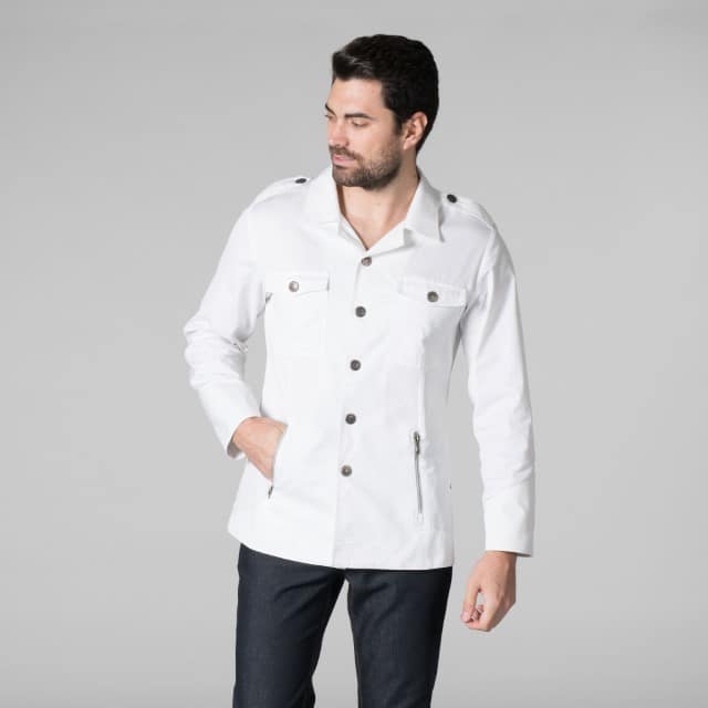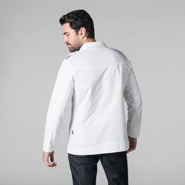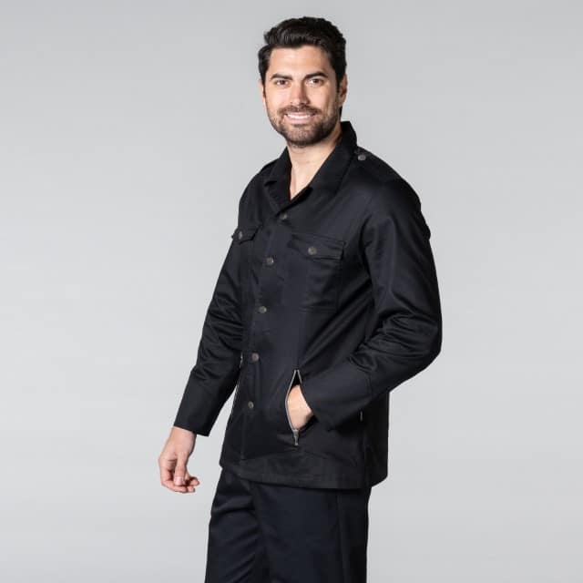 - Descripción: Chaqueta unisex en manga larga, con cuello de solapa, cierre central mediante botones de presión vistos, sardinetas fijas en los hombros, dos bolsillos con cremallera en las pinzas de talle y otros dos bolsillos de parche en pecho. Modelo semi ajustado, confeccionado en SARGA ELÁSTICA en color blanco o negro, con tejido técnico AEROSILVER en el canesú de las espalda. Ideal para uniforme de camareros, cocineros y chefs en hostelería, restauración y cocina en general o para comercio.