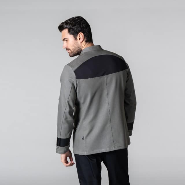 - Descripción: Chaqueta unisex en manga larga, con cuello mao, cierre central mediante botones de presión vistos, un bolsillo en la manga izquierda y dos falsos bolsillos de cartera delanteros. Modelo semi ajustado, confeccionado en VAQUERO ELÁSTICO de color gris, con tejido técnico AEROSILVER en el canesú de la espalda y detalles de POLIPIEL negra en puños y hombros. Ideal como uniforme para camareros, cocineros y chefs en hostelería, restauración y cocina en general.