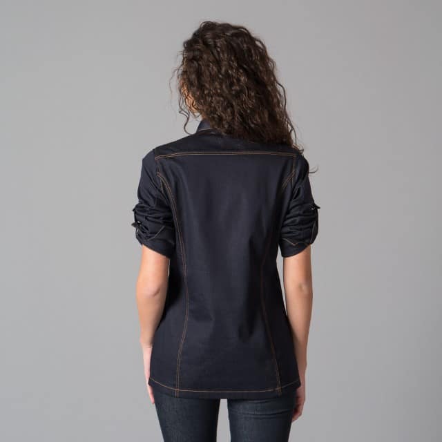 - Descripción: Chaqueta para mujer en manga larga tipo roll up con corchete, con cuello tirilla, puños vueltos, un bolsillo en el pecho izquierdo y cierre central mediante botones de presión ocultos, el primero de ellos visto. Modelo ajustado, con costadillos en delantero y espalda. Confeccionada en TEJANO ELÁSTICO SIN LAVAR. Ideal para uniforme de camareras, cocineras y chefs en hostelería, restauración y cocina en general o para comercio. Disponible en modelo para hombre referencia 946600.