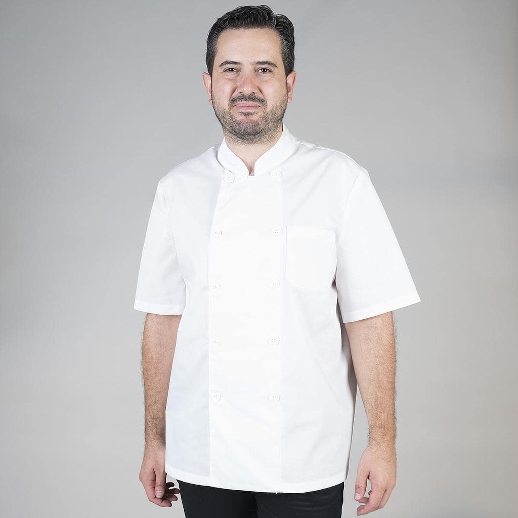 - Descripción: Chaqueta unisex en manga corta, con cierre cruzado mediante botones de pastilla vistos y un bolsillo en pecho izquierdo. Modelo semi ajustado, con costadillos en espalda. Confeccionada en SARGA de color blanco. Es un básico para cocineros y chefs en hostelería, restauración y cocina en general.
