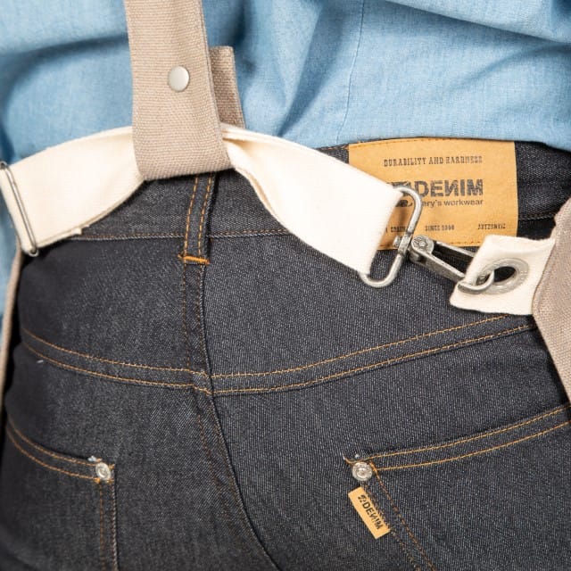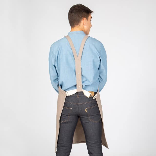 - Descripción: Delantal de peto con dos bolsillos centrales delanteros. Dispone de un original sistema de cierre mediante mosquetón y hebilla regulable en el costado. Los tirantes del peto son regulables mediante botón de presión. Ideal para uniforme de bares, restaurantes, cafeterías, chefs o comercios.