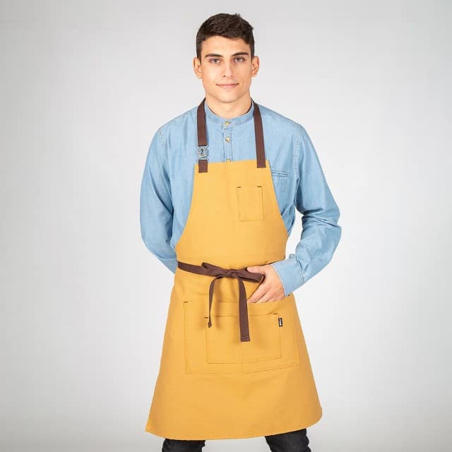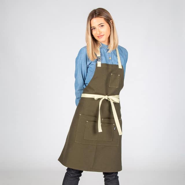 - Descripción: Delantal de peto con cinco bolsillos delanteros. Cuenta con un original cierre mediante hebilla entrelazada en el tirante del cuello y tiras laterales para anudar. Modelo en color albero, gris, rojo, verde caqui o gris marengo. Ideal para uniforme de bares, restaurantes, cafeterías, chefs o comercios.