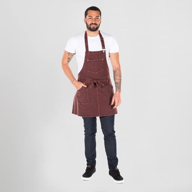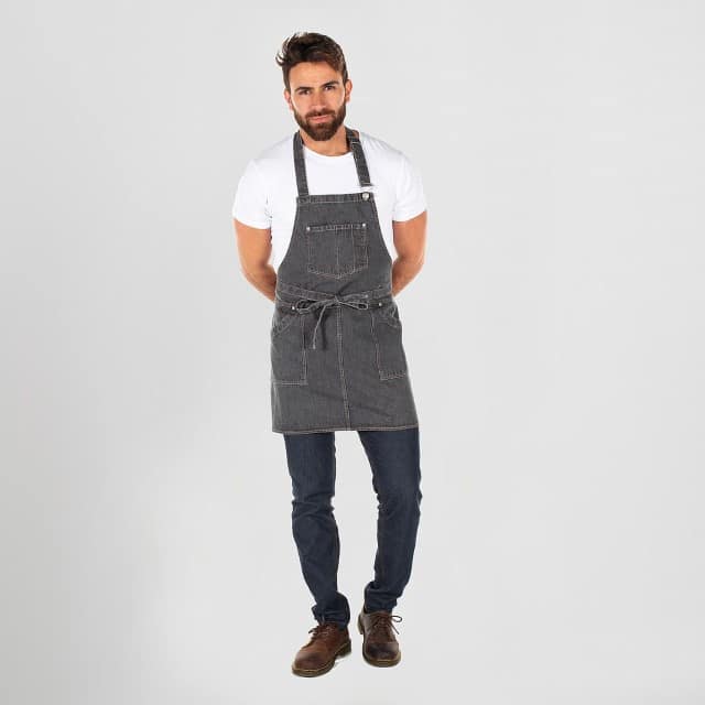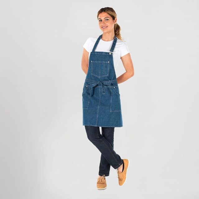 - Descripción: Delantal con peto, confeccionado en vaquero lavado de 100% Algodón. Dispone de cinco bolsillos delanteros. La tira del peto se puede ajustar con una hebilla reguladora y se enchancha mediante botón y hebilla. Ideal para uniforme de bares y restaurantes, camareros, barberías o comercios.