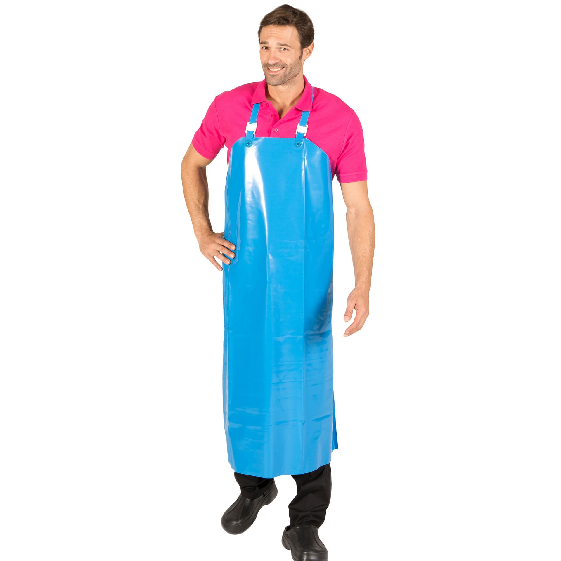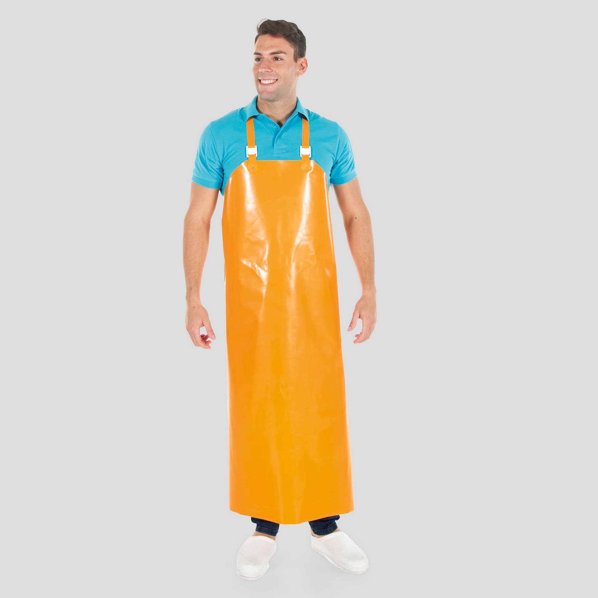 Descripción: -Delantal rígido. -Fabricado en Poliuretano. -Sin bolsillos. -Arnés regulable y ollados termosellados, no metálicos.