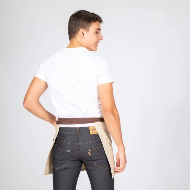 - Descripción: Delantal corto con dos bolsillos delanteros. Cuenta con tiras laterales para anudar. Ideal para uniforme de bares, restaurantes, cafeterías o comercios.