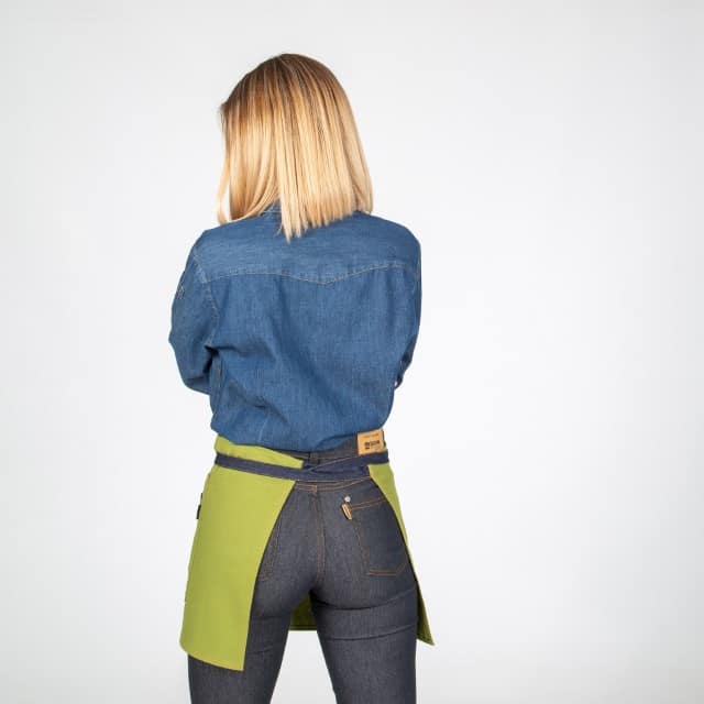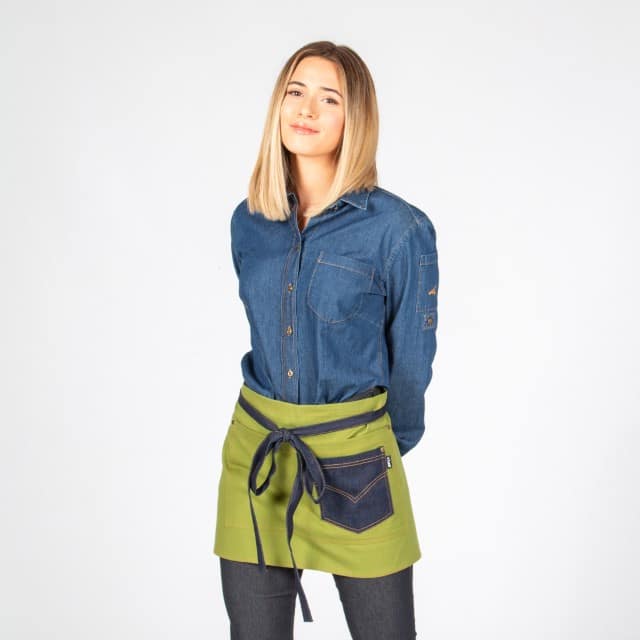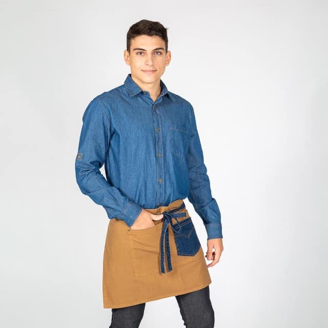 - Descripción: Delantal corto con tres bolsillos delanteros. Modelo perteneciente a nuestra gama REDLINE, confeccionado en CANVAS de color albero o verde oliva, combinado en tejano añil. Ideal para uniforme de bares, restaurantes, cafeterías, chefs o comercios.