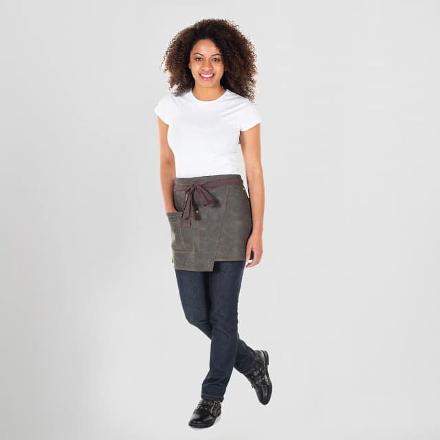 - Descripción: Delantal corto confeccionado en polipiel con las cintas para anudar en algodón. Dispone de dos bolsillos delanteros y enganche para el bolígrafo. Perfecto para uniforme de camarero en bares y restaurantes, barbería o comercio.