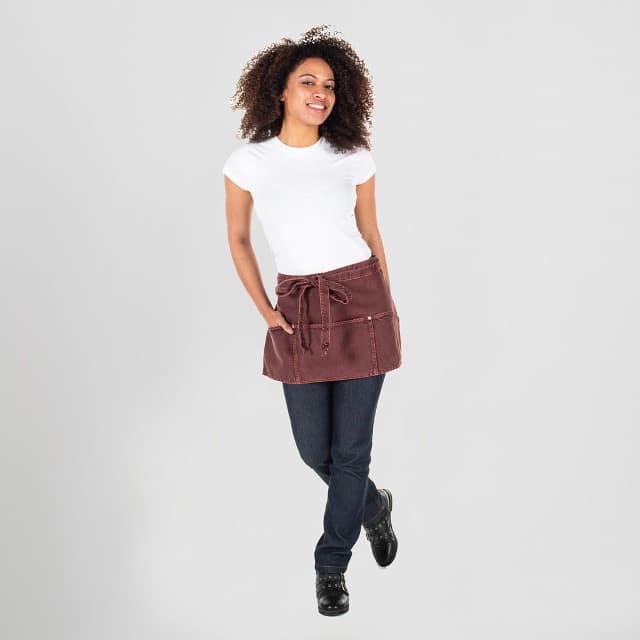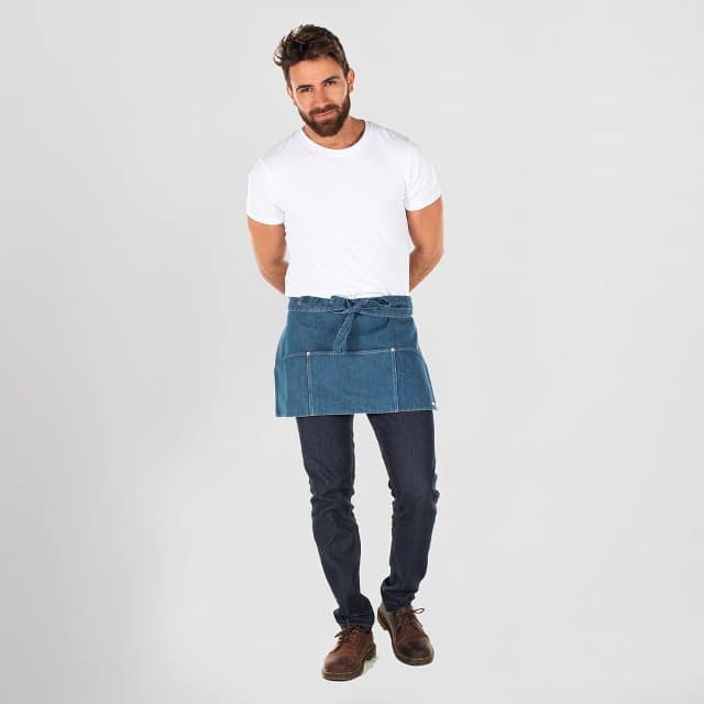 - Descripción: Delantal corto confeccionado en vaquero lavado de 100% Algodón, con tiras para anudar del mismo tejido y tres bolsillos delanteros. Ideal para uniforme de camarero en bares y restaurantes, barbería o comercio.