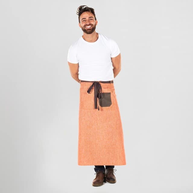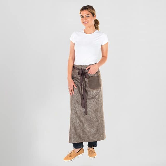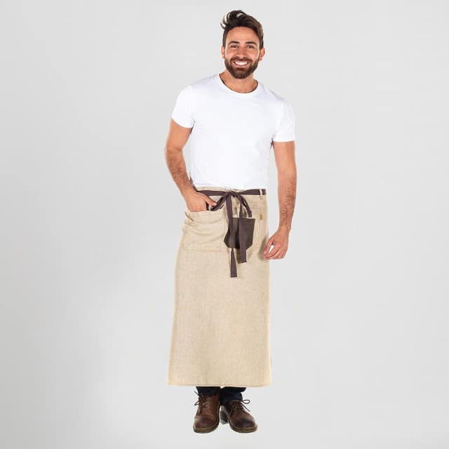 - Descripción: Delantal largo francés, confeccionado en Arpillera de 100% Poliéster. Cuenta con tres bolsillos delanteros, trabillas en la cintura y tiras de ajuste en algodón, enganchadas mediante ollados. Ideal para uniforme de camarero en bares, restaurantes y cafeterías, chefs o comercio en general.