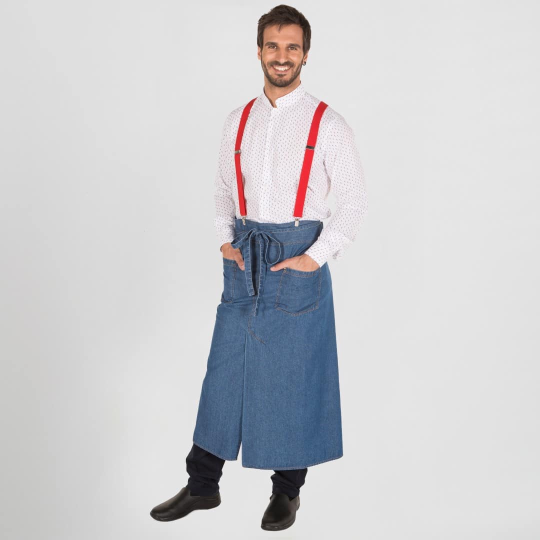 - Descripción: Delantal de tejano lavado. – Dos bolsillos delanteros. – Abertura en centro delantero. – Medidas 90 x 105 cm.