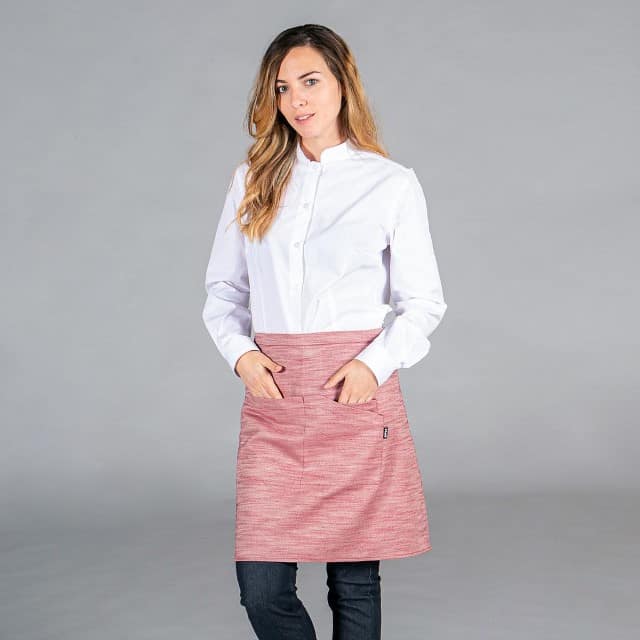 - Descripción: Delantal con peto confeccionado en Sarga Rústica de 50% Algodón – 50% Poliéster. Mono de espiga en delantero para colgar paño y tres bolsillos delanteros. Cintas de espiga para anudar. Ideal como uniforme de camarero en bares, restaurantes, cafeterías y comercio en general.