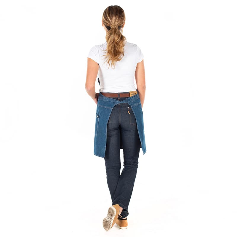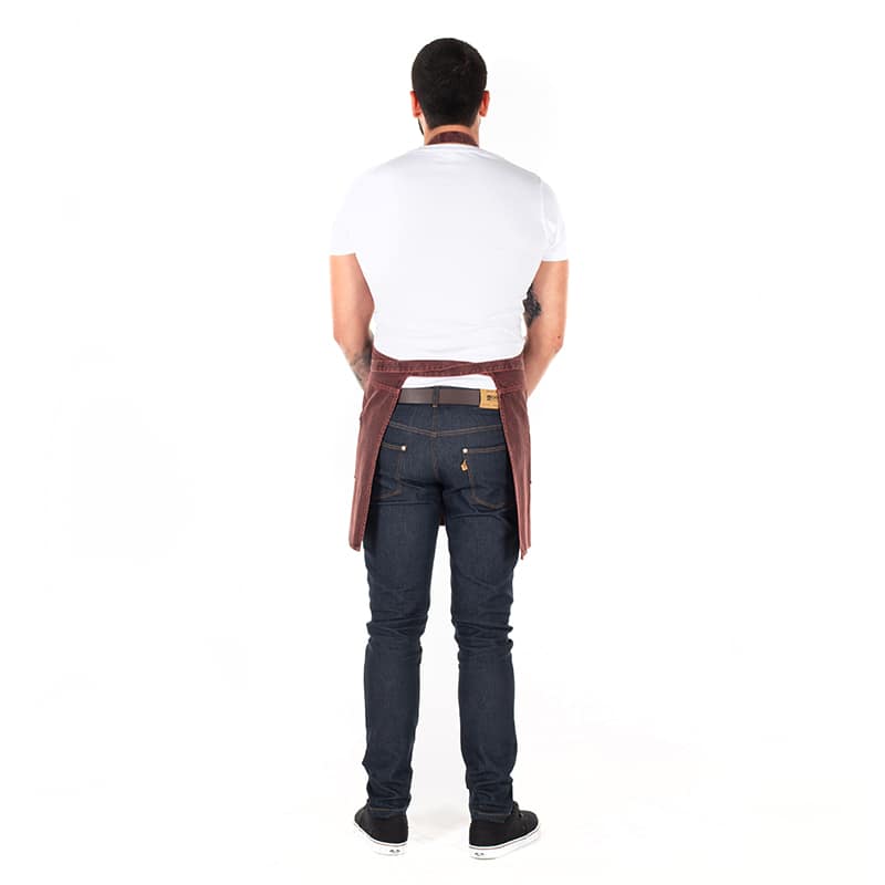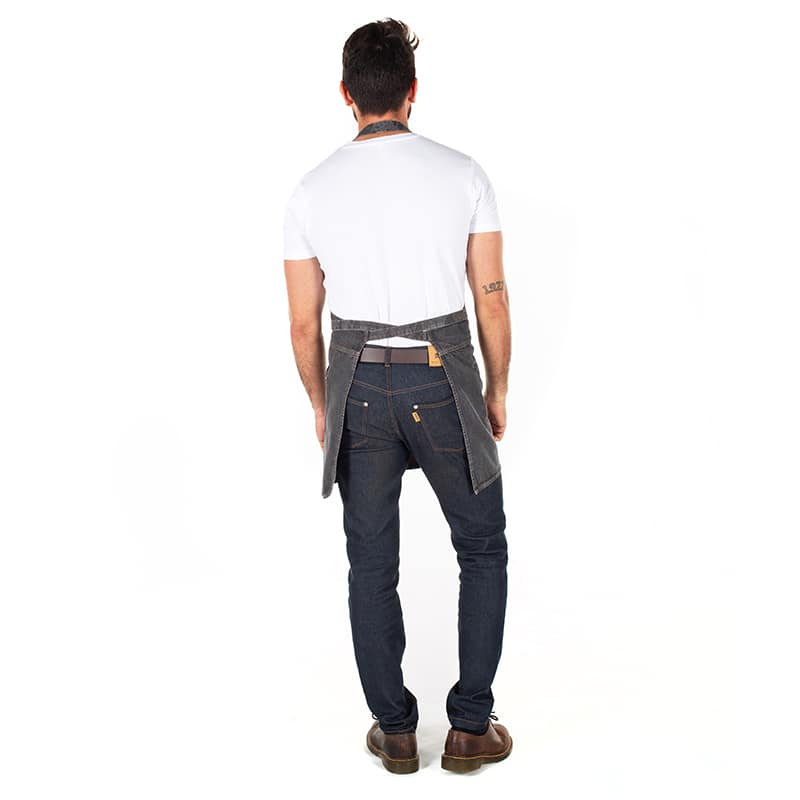 - Descripción: -Delantal con peto. -Prenda lavada. -Hebilla para regular la tira del peto. -Enganche mediante botón y hebilla para el peto. -Medidas 68 x 77 cm.