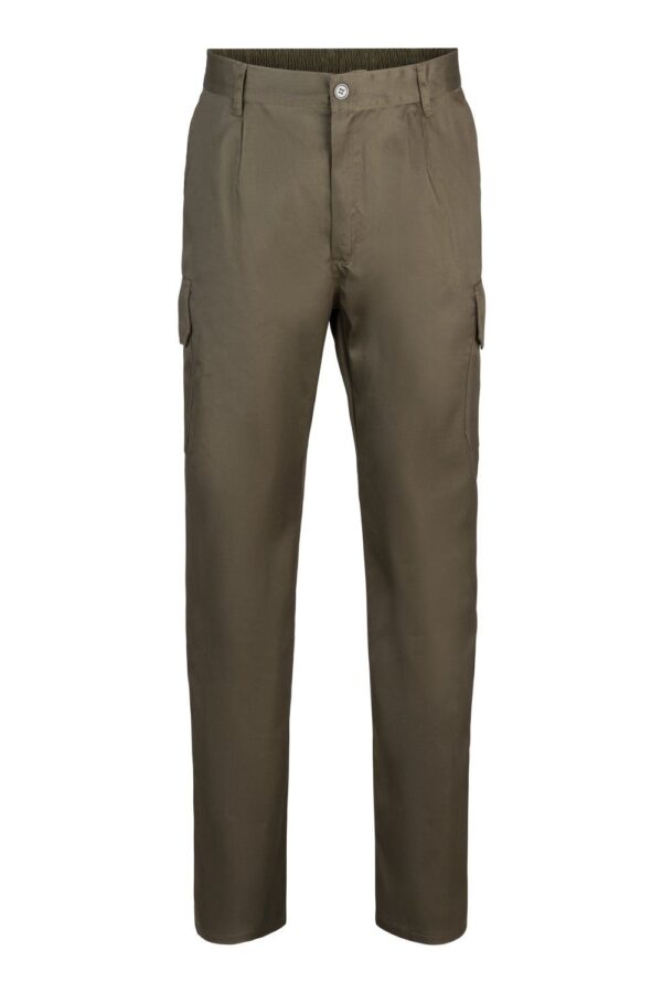 - Descripción: Cierre central con cremallera y botón – Cinturilla elástica – Costura trasera de seguridad – Pinzas – Seis bolsillos: – 2 bolsillos franceses – 2 bolsillos de parche, con fuelle central, tapeta y velcro – 2 bolsillos traseros de fuelle, con tapeta y velcro